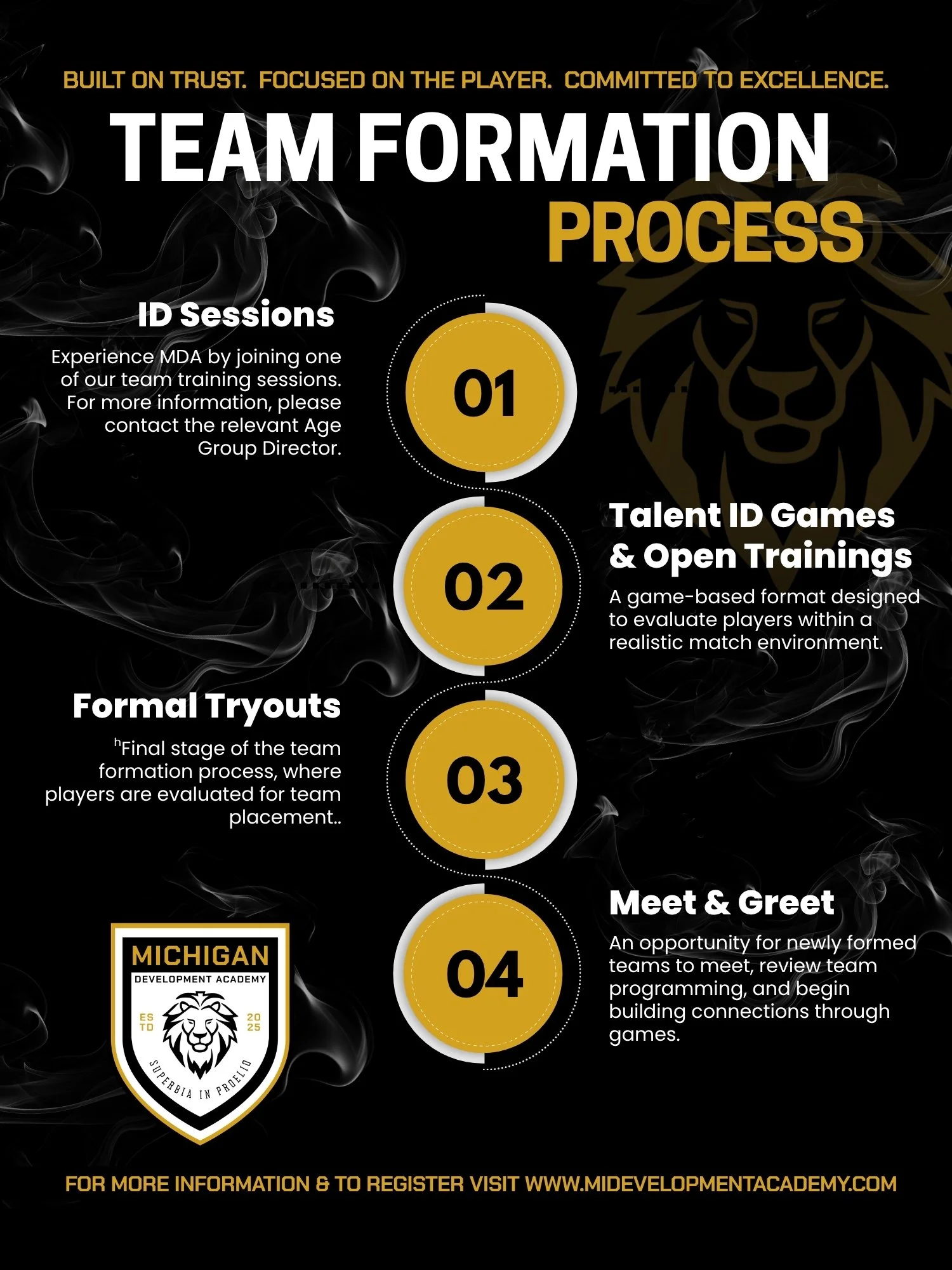 Michigan Development Academy was created to provide players with a truly unique soccer experience, with a strong focus on player development at every level. We are committed to fostering a family atmosphere and cultivating a positive, transparent culture built on open communication, mutual respect, and shared goals.